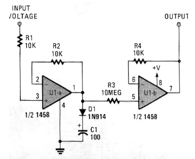 Este circuito está en una revista americana de 1993. El circuito integrado 1458 es en realidad un doble 741. La fuente no necesita ser simétrica y el valor de la tensión de pico depende de R2 y R1. La tensión de alimentación puede oscilar entre 5 y 12 V y la tensión detectada debe ser siempre inferior a la tensión de alimentación del circuito.