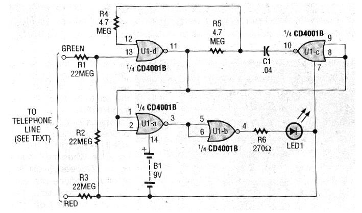 El circuito presentado salió en una revista Popular Electronics de 1993. Es un indicador que hace que un LED señale cuando la línea telefónica está en uso, por ejemplo, una extensión que se utiliza. Como el consumo es muy bajo, se puede utilizar una pequeña batería de 9 V en su alimentación. El circuito integrado es de los más comunes y el montaje puede ser hecho con facilidad, incluso en nuestros días.