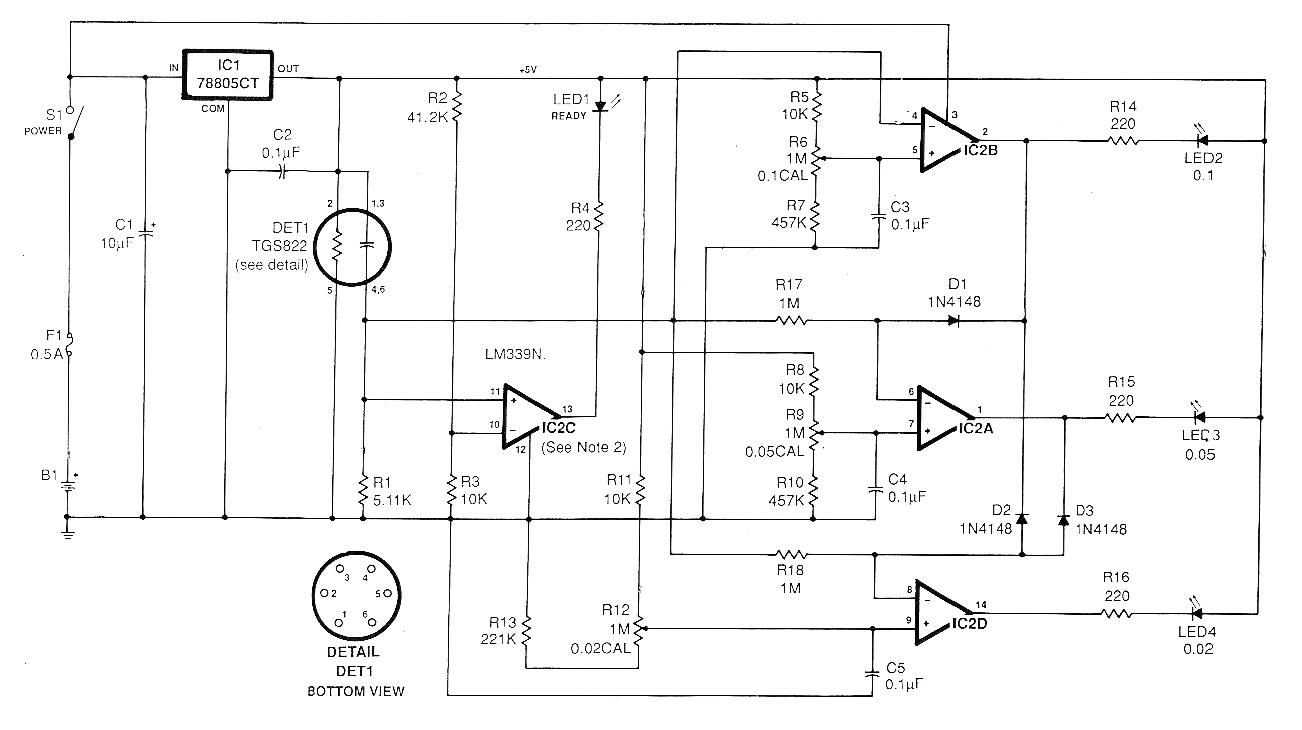 Este esquema forma parte de un proyecto publicado en una revista Modern Electronics de diciembre de 1990. El componente crítico es el sensor. Se recomienda verificar la viabilidad de obtención antes de intentar el montaje. La batería de este circuito puede ser del tipo recargable de 7,2 V o una batería alcalina de 9 V. El circuito proporciona señales para excitar tres LED. El sensor consiste en un tubo en el que se encuentra el detector de gas DET1 debiendo la persona soplar aire en él, para que su "aliento" pueda ser analizado por el circuito. El circuito integrado es el LM339 y en el original hubo un error de diseño al indicar el regulador de tensión que en realidad es LM7805.
