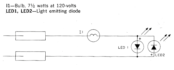 Este circuito, publicado en 1979, utiliza una lámpara de 7,5 W x 120 V para reducir la tensión y alimentar los LED con una corriente del orden de 50 mA. Se deben utilizar LEDs que soporten esta corriente o una lámpara más pequeña, por ejemplo de 4 W. Los LED en oposición deben encenderse con la tensión alterna. Nunca utilice un LED único, ya que puede quemarse.