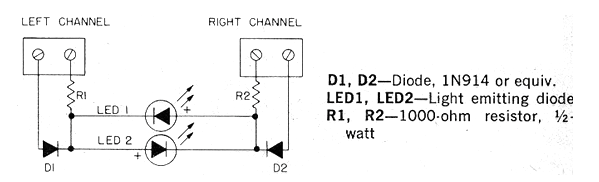 Este circuito publicado en una revista de 1979 sirve para indicar a través del encendido de LED cuando tenemos una señal estéreo en la salida de un amplificador. Cuando usamos la función MONO usamos este circuito para ajustar el volumen de los dos canales de modo que ellos sean perfectamente iguales, lo que ocurre cuando los LED no se encienden. El circuito no necesita alimentación externa y funciona con amplificadores de 5 a 50 W.
