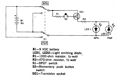 Publicado en el 101 Electronics Projects de 1976, este es un simple probador de transistores. El LED sólo debe encenderse cuando se presione S2. Si se enciende antes, el transistor está en corto. Si no se enciende al presionar, está abierto. Observe la posición de la llave para transistores NPN y PNP. El colector del transistor en prueba está conectado a R2. El circuito prueba transistores de uso general.