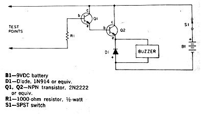 Este probador de continuidad acciona un buzzer de 6 a 9 V según la tensión utilizada en la alimentación. El circuito fue sugerido por 101 Electronics Projects, publicación americana de 1976. El buzzer es de baja corriente con oscilador incorporado y se pueden utilizar transistores equivalentes como los BC548.