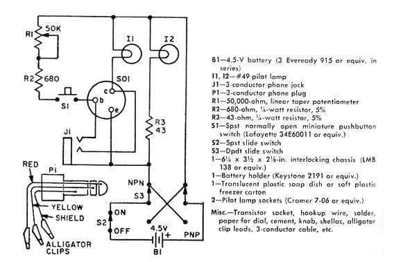 Este circuito fue indicado en el artículo de la revista americana Electronics Hobbyst de 1971. La revista ya no existe, pero el proyecto se puede montar fácilmente, ya que los componentes son comunes excepto las lámparas. Utilice lámparas de 6 V x 50 a 100 mA y cambie la alimentación por 6 V (4 pilas). El sistema también utiliza un jack con hilos y garras para conectar los transistores fuera del zócalo. El potenciómetro R1 puede ser de 47 k.