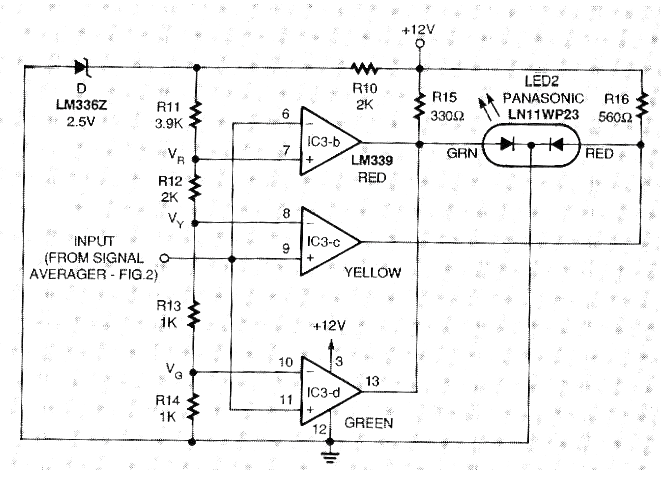 Este circuito indica el nivel de tensión de entrada en un LED bicolor que entonces produce tres colores diferentes. Verde, rojo o bien la mezcla de las dos. Las tensiones Vr, Vy y Vg dadas por el divisor resistivo de entrada son las que determinan el rango de encendido que en el caso está entre 0 y 2,5 V. Esta banda puede ser alterada por el cambio del zener D. El circuito funciona con tensiones de 9 A 12 V. Este circuito salió en una Electronics Now, publicación americana de enero de 1996. El LED puede ser de cualquier tipo bicolor en lugar del original.