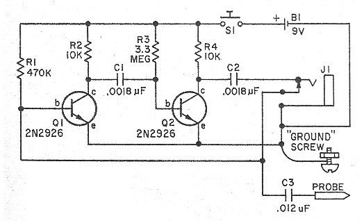 Este circuito fue indicado en el artículo de la revista americana Electronics Hobbyst del invierno de 1971. La revista ya no existe, pero el proyecto puede ser montado con facilidad, pues los componentes son comunes, sólo cambiando los transistores por los BC548. El circuito también puede ser alimentado por 4 pilas (6 V) con los transistores BC.