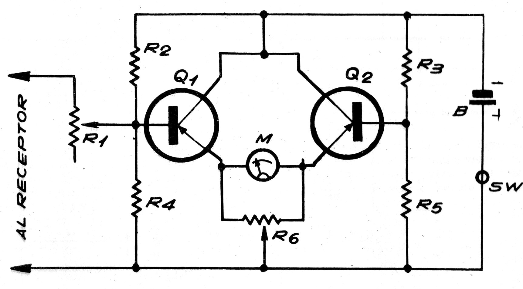 Los esímetros o S-meter son medidores de intensidad de señal, acoplados a receptores de telecomunicaciones para indicar la intensidad de la señal de la estación que se está recibiendo. Este circuito utiliza un indicador de 0-1 mA y el ajuste es hecho por R6 de 47k. Los transistores son BC558 y el circuito se alimenta con pilas. R1 es de 10k y R2 / R3 de 22k. R4 y R5 son resistores de 10k. El circuito se conecta al detector del receptor. El circuito es de una publicación de los años 70. La alimentación se realiza con 3 V.