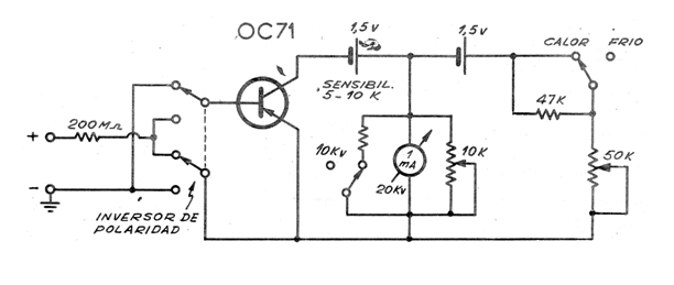 Este voltímetro tiene una resistencia de entrada de 200 M ohms (se pueden utilizar resistencias de 47 M ohms en serie para obtener esa resistencia). El circuito es de una publicación argentina de 1973 y transistores equivalentes pueden ser empleados. El potenciómetro de ajuste de nulo de 50k puede ser de 47k. La escala de corrientes de 1 mA de un multímetro común puede utilizarse en lugar del instrumento original.