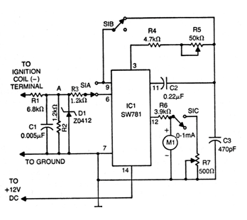 Este circuito se obtuvo en una antigua publicación de 1978. El circuito integrado es el componente crítico ya que ya no se fabrica. El circuito se utiliza para medir la rotación de los motores y el ángulo de apertura del sistema de encendido con platino. El circuito no sirve para vehículos modernos con ignición e inyección electrónica.