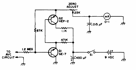 Encontramos este circuito en una publicación para radioaficionados de 1977. Su finalidad es medir la intensidad de la señal captada en un receptor. El instrumento es de 0-1 mA y los transistores pueden ser los BC558 y BC548. El circuito utiliza la señal del AVC del receptor.