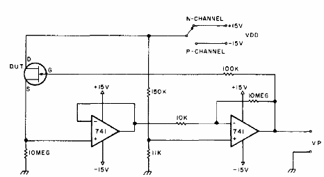 Encontramos este circuito en una publicación americana antigua. Con él es posible hacer la prueba de FETs comunes usando un multímetro como indicador en la salida. La alimentación se puede hacer con una fuente simétrica de menor tensión.