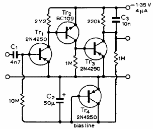 Este amplificador, para detectar señales biológicas en transmisores implantados, utiliza transistores como el BC549 y el BC559. Las aplicaciones son la detección de potenciales del cerebro y el corazón. La ganancia de tensión es 2000 y el consumo es de sólo 4 uA con alimentación de 1,35 V. La banda pasante es de aproximadamente 5 kHz.