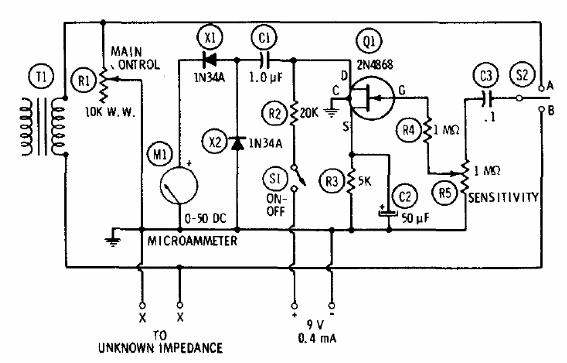 El FET de este circuito de una documentación de 1977 puede ser el BF245 o MPF102. El circuito mide las impedancias indicadas por un instrumento. Las frecuencias normalmente usadas en la prueba son entre 400 y 500 Hz.