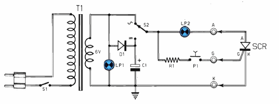 Este probador de SCR común fue encontrado en una revista italiana Elettronica Práctica el 9 de 1977. El circuito prueba SCRs como el TIC106 teniendo por indicador una lámpara de 6 V x 50 a 300 mA. El transformador tiene un secundario de 6 V con al menos 200 mA.