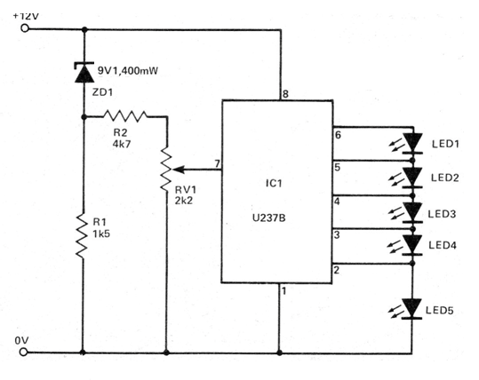 Este circuito monitorea el estado de una batería de 12 V que se puede utilizar directamente con una, o aún en un circuito de carga. El circuito es de una documentación antigua de 1982 y RV1 debe ser ajustado para que el LED3, que indica el estado normal se encienda.