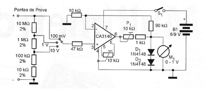 El circuito de la figura permite implementar un multímetro de alta sensibilidad o incluso usar un multímetro común obteniéndose características de alta sensibilidad. La selección de las pistas es hecha por la llave y tiene fondos de 100 mV, 1 V y 10 V. El fondo de escala es determinado por el resistor R1 junto con R6. Esta ganancia se puede cambiar si el lector desea modificar las escalas del instrumento. El instrumento indicador es un voltímetro con 1 V de fondo de escala, o un multímetro ajustado para esa escala. La sensibilidad del circuito es de 1 M ohms / V. La alimentación es hecha por una batería de 9 V y como el consumo es extremadamente bajo, su durabilidad será muy grande.
