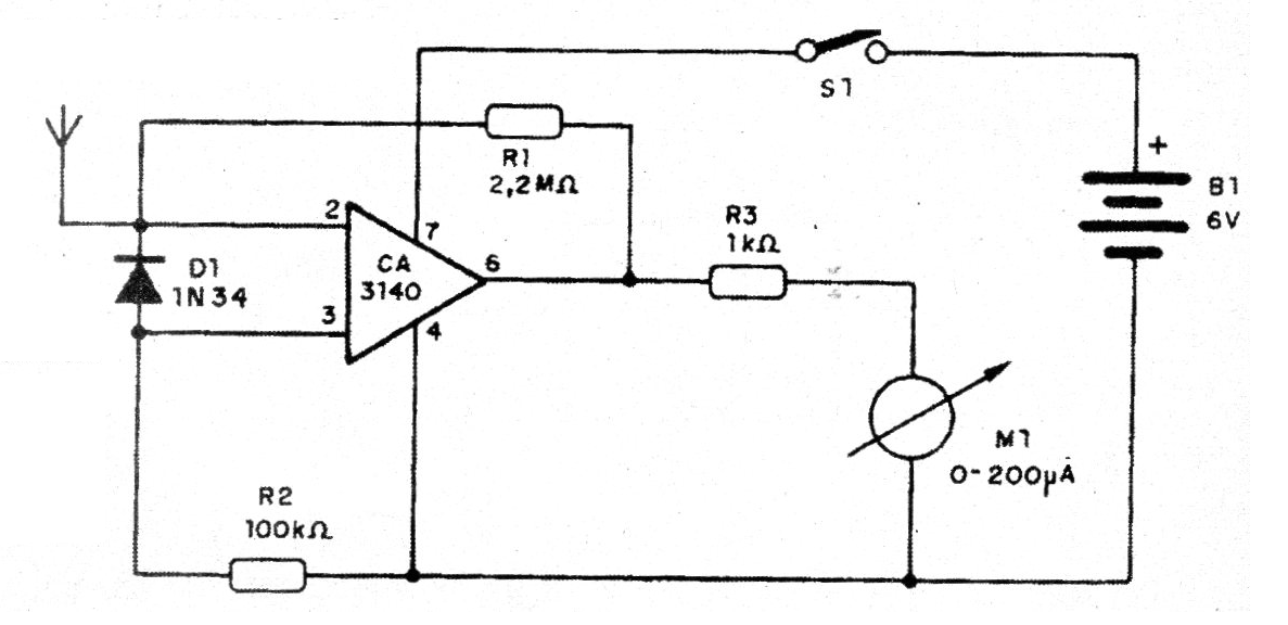 Este circuito aperiódico puede medir la intensidad de las señales hasta unos 500 MHz con el diodo indicado. Con diodos especiales para frecuencias mayores, las señales de escape de los hornos de microondas también se pueden detectar. El instrumento puede tener fondos de escala de 100 uA a 1 mA y la antena es del tipo telescópico.