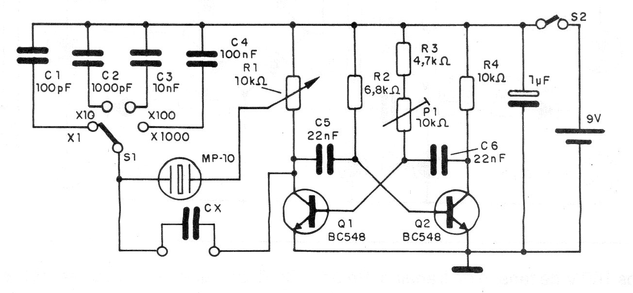 Este circuito se ha encontrado en una documentación técnica antigua, pero es actual por los componentes que utiliza. Se trata de un puente para medida de capacitaciones que puede calibrarse con la ayuda de capacitores de valores conocidos. El ajuste de nulo y consecuente lectura de la capacitancia se realiza en P1. El transductor puede ser cualquier cápsula piezoeléctrica común.