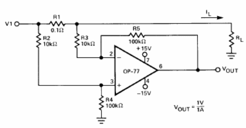 En la figura se muestra cómo implementar un circuito de monitor de corriente utilizando sólo un amplificador operacional. Hemos obtenido esta configuración en el manual de circuitos integrados de Analog Devices. Este circuito opera con fuentes hasta 15 + 15 V, lo que es ideal para aplicaciones como en circuitos de puentes de onda completa. Observe que la salida del circuito es de 1 V por amperio, valor dado por la resistencia R1. La precisión de este resistor va, por lo tanto, determinar la precisión de la salida del circuito. Otra característica de este circuito que merece destaque es su gran rechazo en modo común que llega a los 120 dB, por el circuito integrado utilizado ..