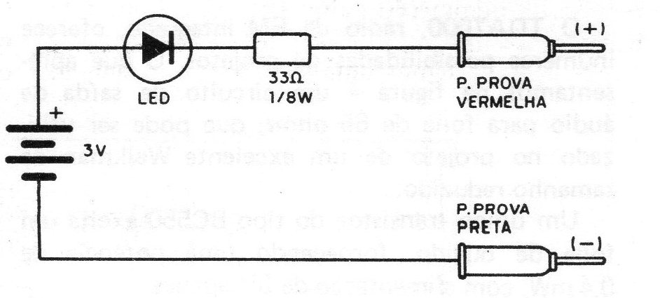 El circuito de la figura verifica la continuidad de componentes, siendo ideal en la bancada de los estudiantes y principiantes que no tienen condiciones de comprar un multímetro. En la prueba de continuidad el LED se enciende si la resistencia del circuito analizado es inferior a 1 k y permanece apagada, o con un brillo muy reducido, con resistencias por encima de ésta. Los siguientes son los componentes que deben hacer el LED encenderse cuando son buenos: altavoces, transformadores, inductores, diodos cuando están polarizados directamente, interruptores, lámparas, fusibles, resistores por debajo de 1k. Los componentes que no deben dejar el LED encenderse cuando son buenos: diodos polarizados inversamente, resistores por encima de 1k, condensadores, lámparas de neón. La batería utilizada consiste en dos pilas pequeñas y el LED es rojo, común.