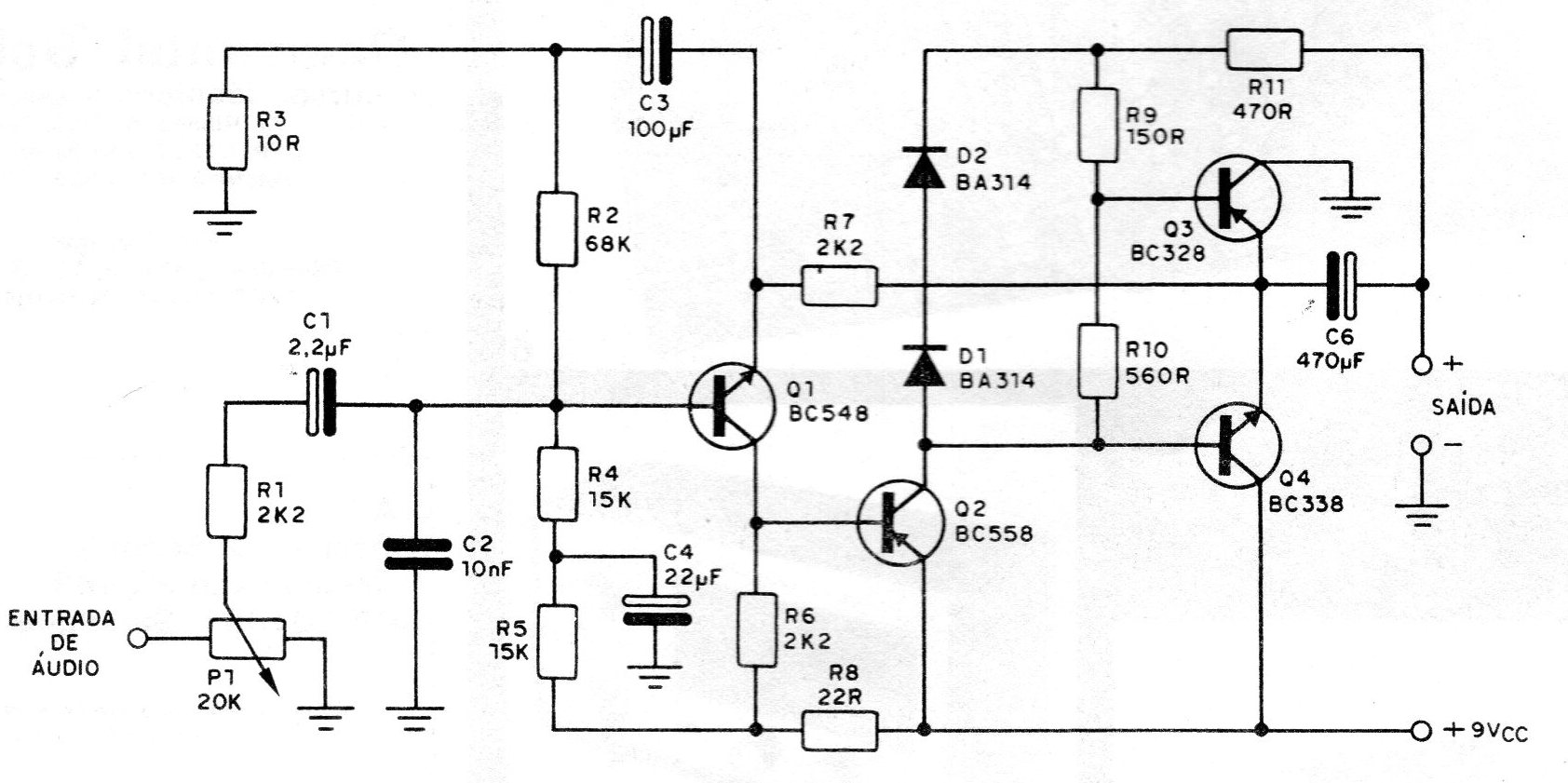 Para la prueba de componentes, en la bancada, la presencia de un amplificador que proporciona señal pura con algunos cientos de miliwatts de potencia es indispensable. El amplificador que presentamos tiene excelente calidad de sonido, pues utiliza transistores en salida de simetría complementaria, y además tiene óptima sensibilidad para la prueba de etapas que tienen señales de bajo nivel de intensidad. El hobista podrá usar este amplificador en la prueba de micrófonos, cápsulas fonográficas, como seguidor de señales, en la prueba de altavoces (que serán conectados en su salida), auriculares, etc. Se utilizan cuatro transistores de uso general en este amplificador, que tendrá su mejor rendimiento con alimentación de 9 V (también funciona con 6V). Los transistores NPN pueden ser los BC548 o equivalentes, como los BC238, BC547 y BC237. El PNP del paso de salida puede ser el BC328 y el NPN de la salida el BC338. Los diodos son BA314 y todos los resistores de 1 / 8W. El potenciómetro P1 puede ser de 22 k o 47 k con llave, y los capacitores electrolíticos para 12 V o más. En el montaje se deben hacer conexiones cortas y la entrada, si se hace con cable largo, debe tener cable blindado.