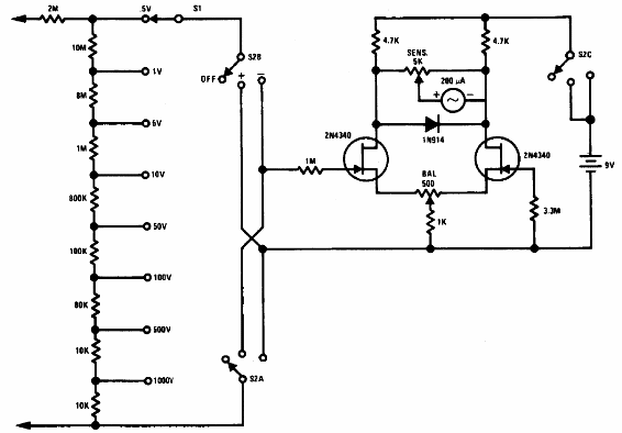 Esta configuración común de voltímetro con par diferencial de FET se obtuvo en el Linear Applications Handbook de National Semiconductor de 1994. El circuito tiene bajo consumo y la precisión depende de los resistores usados en la red divisora de entrada. Los FET pueden ser los BF245.