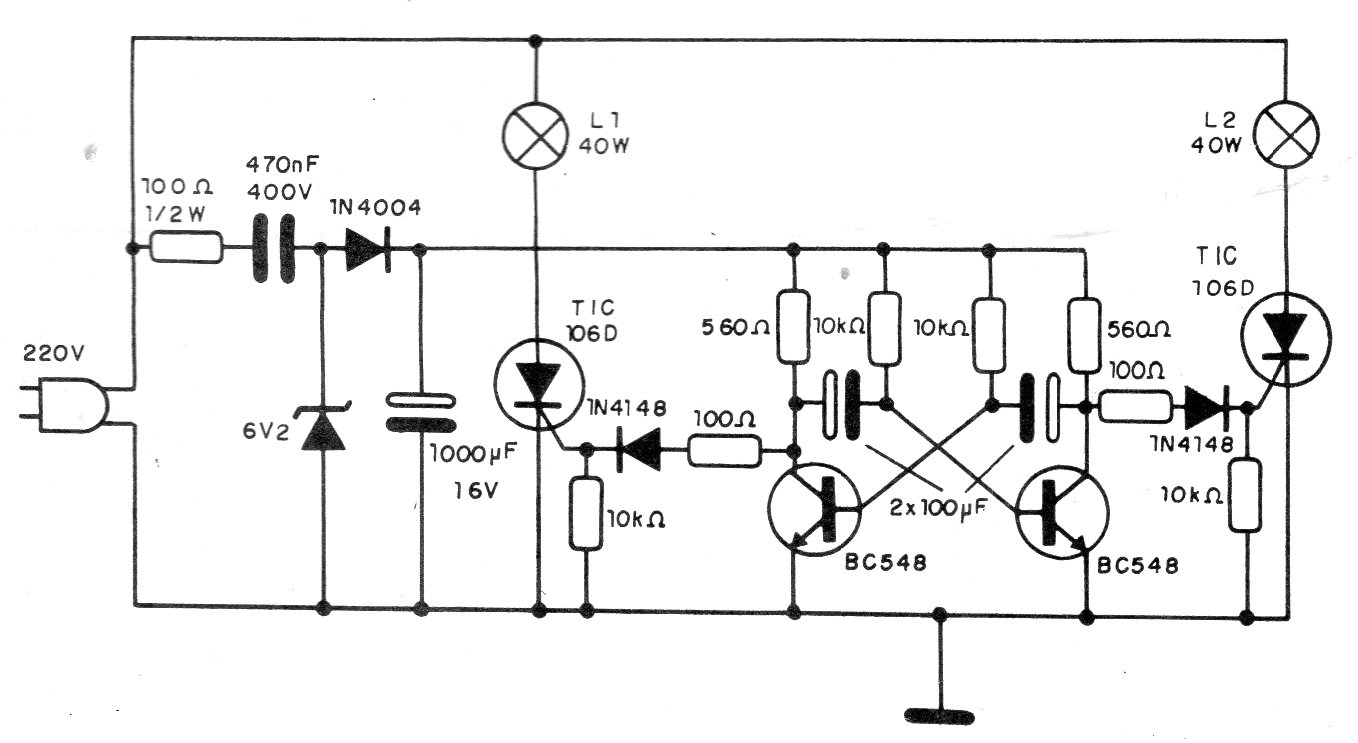 Este circuito de una documentación de 1992 fue originalmente diseñado para funcionar con lámparas incandescentes. El circuito consiste en un astable que dispara alternativamente dos SCR. La frecuencia de accionamiento alternativo es dada por los capacitores. El circuito puede ser adaptado para operar en la red de 110 V, bastando aumentar el condensador de 470 nF a 1 uF. Se debe utilizar un capacitor de poliéster.