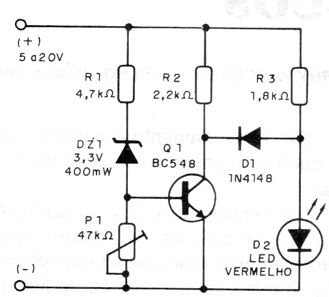 Encontramos este simple circuito indicador de subtensión en una publicación de 1992. El circuito acciona un LED cuando la tensión cae por debajo del valor de ajuste trimpot. Los Zeners con otros valores se pueden utilizar de acuerdo con el rango de tensiones de ajuste.
