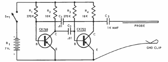 Este multivibrador asequible bien conocido de todos fue encontrado en el manual de aplicaciones de transistores de Raytheon de 1957, pudiendo ser montado con transistores más modernos como los BC558. La alimentación puede oscilar entre 6 y 9 V.