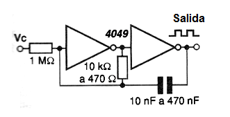 Una versión simple de VCO CMOS usando los convertidores del 4049 se muestra en la figura. Este circuito puede ser alimentado con tensiones entre 3 y 15 V siendo la frecuencia generada dependiente del condensador y del resistor. La tensión de control debe estar entre 0 y la tensión de alimentación. La señal producida es rectangular y en este caso la amplitud de la señal es constante, igual a la tensión de alimentación. Recordamos que este circuito no funciona más allá de algunos megahertz.