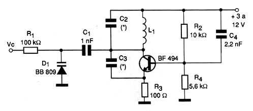 En la figura mostramos un VCO controlado por Varicap capaz de generar señales en la banda de algunos megahertz hasta más de 200 MHz. Si bien el control de la frecuencia se logra cuando se utiliza un varicap como el BNB809, incluso un diodo común como el 1N4002 funciona como tal, pero con una banda menor de actuación. La bobina, C2 y C3 dependen de la frecuencia central generada conforme a la siguiente tabla: