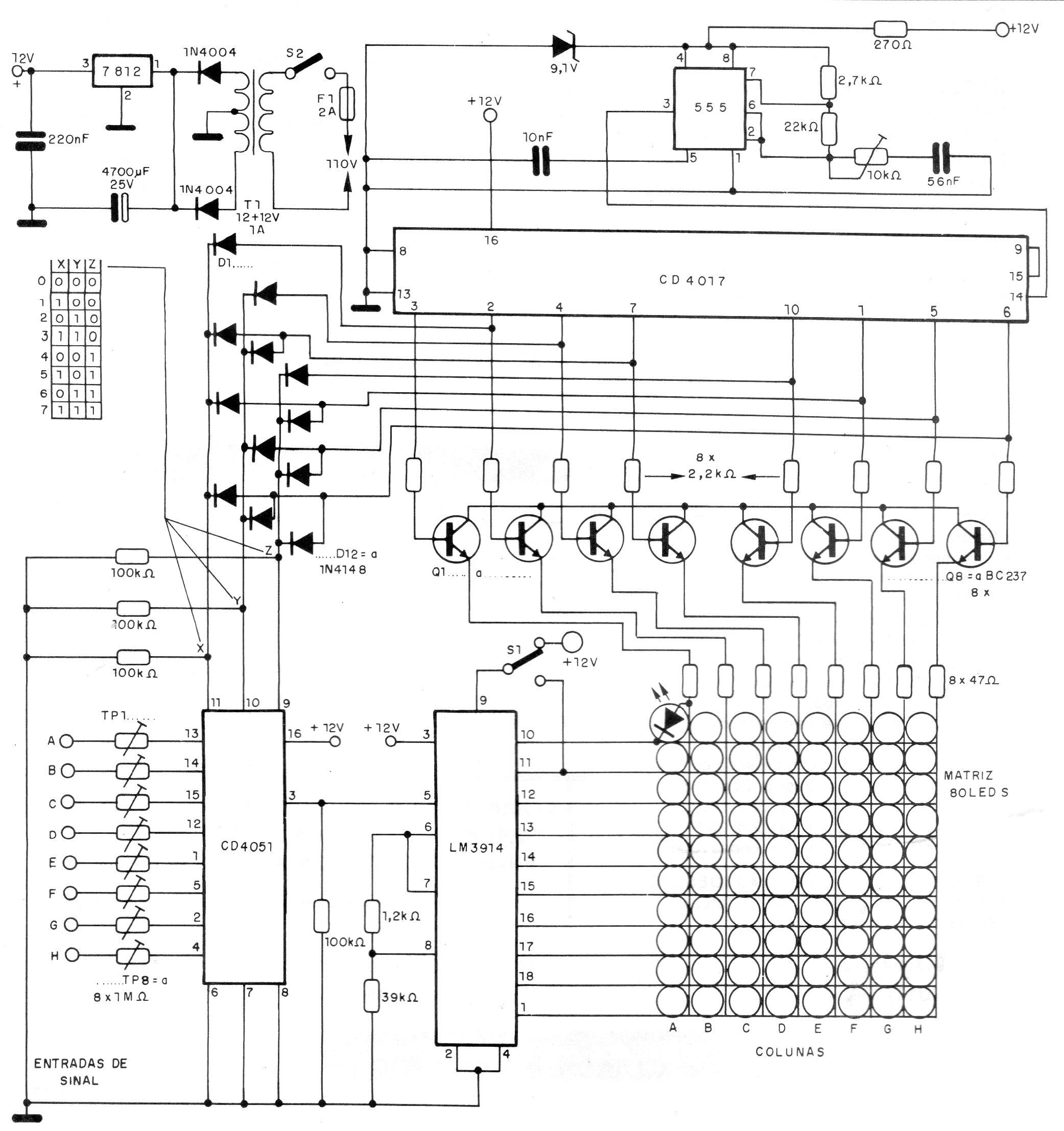 Este display matricial de nivel fue encontrado en una documentación de 1994, pero aún puede ser montado, pues los componentes utilizados todavía son comunes en nuestro mercado. El circuito incluye su propia fuente de alimentación y utiliza una matriz de 64 LED.