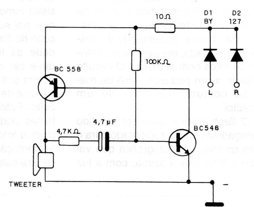 Este simple circuito práctico se puede adaptar en una moto para indicar el accionamiento de la flecha. El altavoz es del tipo miniatura con 2,5 cm y el circuito se puede instalar en una pequeña caja de plástico alimentada por la propia energía de las lámparas de flecha donde se enciende.