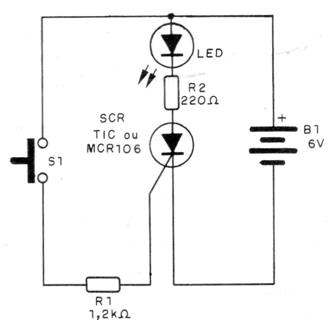 Este circuito hace la prueba simple de SCRs que tienen una corriente de mantenimiento baja, con los de la serie 106. El circuito es alimentado por una tensión de 6 a 12 V. Para probar apriete S1. El LED debe encenderse. Si se enciende antes del disparo es porque está en corto.