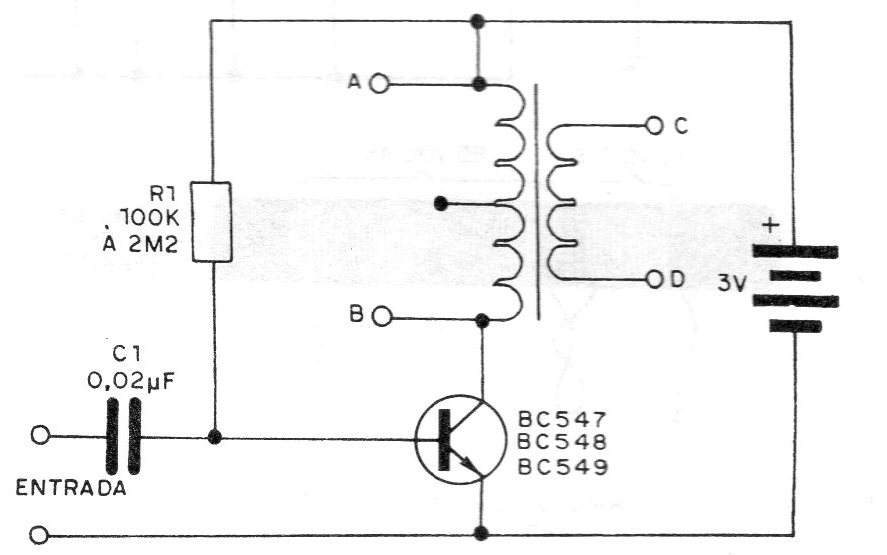 Tenemos aquí un ultra-simple paso amplificador de sólo un transistor, que puede presentar algunas utilidades en la bancada del experimentador. Este circuito es de una documentación de 1982. Usted puede utilizar este circuito como amplificador de prueba para excitar un auricular o pequeño altavoz, puede utilizarlo como etapa de salida reforzadora para auriculares en radios experimentales o aún como seguidor de señales de audio . La ganancia del circuito es fijada por el resistor, cuyo valor puede situarse entre 100 k y 2M2, dependiendo del transistor y del transformador. El transistor BC549 es el que permite una mayor ganancia. Para determinar el valor exacto de R1 se puede usar un potenciómetro en su lugar (de 2M2) y ajustarlo hasta obtener el sonido con mayor intensidad, sin distorsión. El transformador es de salida para transistores, con un devanado primario de 200 ohms a 2 k, y secundario de acuerdo con el altavoz. Tenemos dos posibilidades de conexión de salida: en AB conectamos auriculares de cristal o magnéticos de alta impedancia. En CD se deben conectar auriculares de baja impedancia o altavoces. La alimentación del circuito se realiza con 3 V obtenidos de dos pilas pequeñas conectadas en serie.