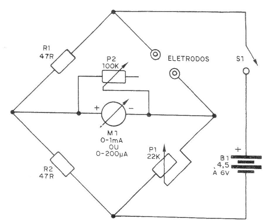 El detector de mentiras que presentamos fue creado por un detective profesional y encontrado en una publicación de 1982. No necesitamos hacer comentarios, por lo tanto, sobre su eficiencia ... El principio de funcionamiento, sin embargo, necesita ser explicado: se basa en este detector, la variación de la resistencia de la piel de un individuo interrogado, en función de su estado de tensión nerviosa. Las pequeñas variaciones de resistencia pueden ser acusadas por el instrumento bastante sensible. Los potenciómetros P1 y P2 sirven para ajustar el punto ideal de funcionamiento, de modo que las variaciones de resistencia puedan ser mejor acusadas por el instrumento. Este instrumento debe ser un miliamperímetro sensible de 0 - 1 mA o un VU de 200 uA. La alimentación del aparato se realiza por 3 o 4 pilas pequeñas, y los electrodos son pequeñas chapas de metal, en las que el interrogado debe apoyar las manos o los dedos.