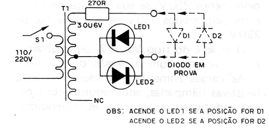 ¿Cómo probar un diodo para el uso general? Quien no posee un multímetro, u otro instrumento que permita la realización de pruebas de diodos, puede fácilmente hacer este tipo de prueba con el circuito mostrado en la figura. La prueba de diodos sirve para probar diodos de todo tipo, siempre que su tensión de trabajo sea superior a 3 V y su corriente máxima superior a 10 mA. Se utilizan dos indicadores LED. El diodo en prueba se conecta a los terminales indicados en la figura. Si un LED se enciende es señal de que el diodo se encuentra en buen estado, y este LED, al mismo tiempo, da la identificación de los terminales del diodo en prueba. Si los dos LED se encienden es señal de que el diodo en prueba se encuentra en corto. Si ninguno de los LED se enciende es señal de que el diodo está abierto. El transformador utilizado tiene un devanado primario de acuerdo con la red local y secundaria de 3 a 6 V, con corriente de al menos 100 mA. El resistor es de 270 o 330 ohms x ¼ W. Los LED son comunes, pudiendo el lector usar los dos rojos o un rojo y otro verde.
