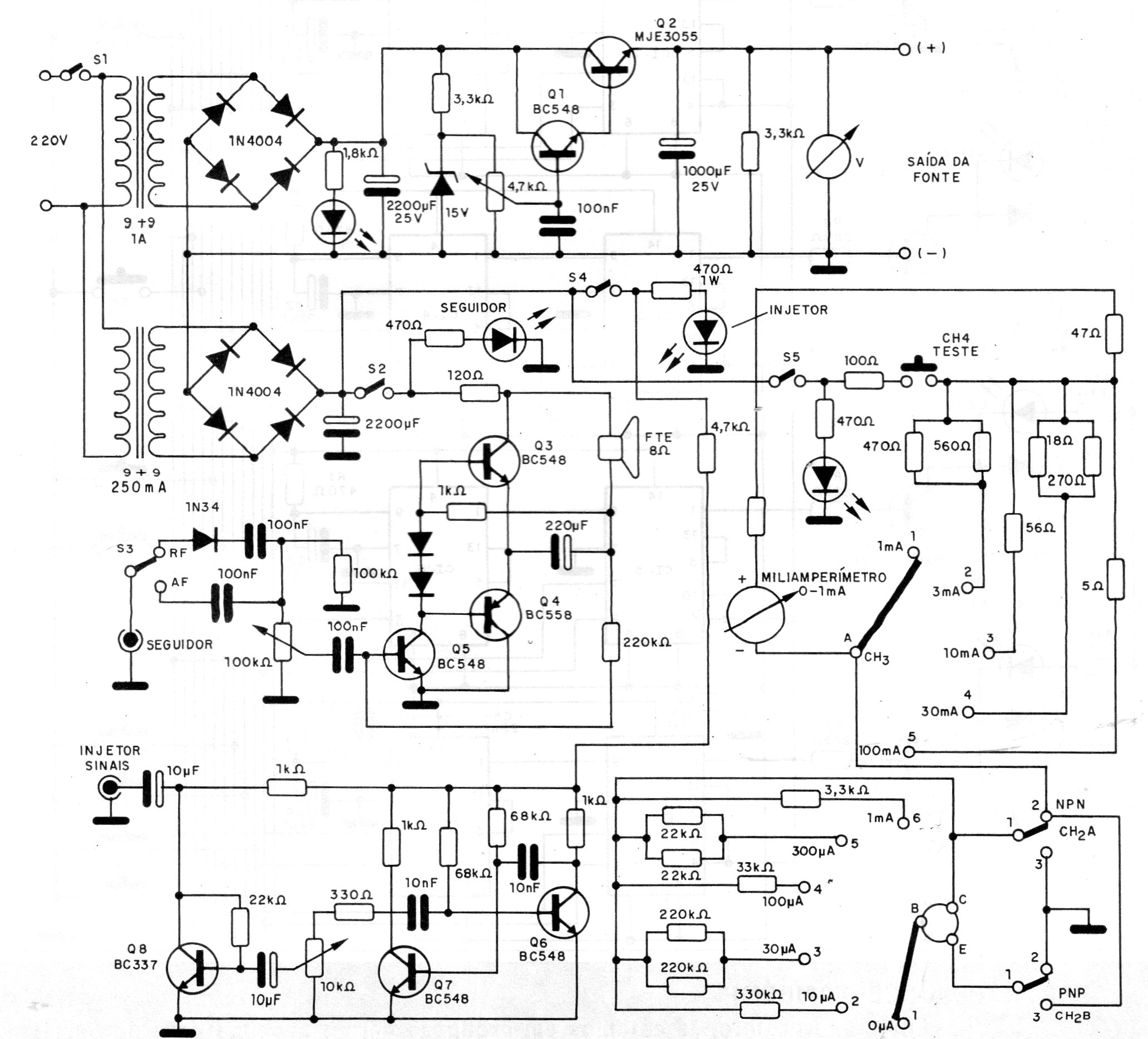 Encontramos este circuito en una documentación de 1995. Incluye varios recursos importantes para una bancada de pruebas, tales como fuente, seguidor de señales, inyector de señales y probador de transistores. El transistor de la fuente debe montarse en un disipador de calor. La fuente es ajustable de 0 a 12 V con salida máxima de 1 A.