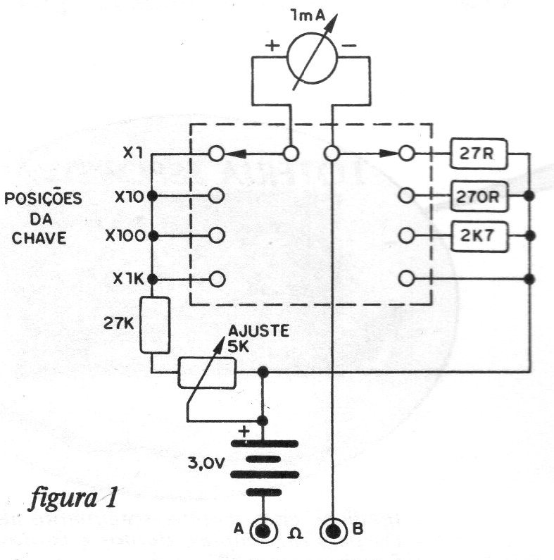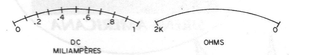 El montaje de un buen multímetro sólo encuentra un obstáculo: la precisión que se obtiene depende de la precisión de los componentes usados. Para los lectores que no tengan ningún instrumento en su banco y que estén empezando ahora, una tolerancia de 5% o 10%, que es la tolerancia de los resistores comúnmente encontrados en el comercio, puede ser aceptable. Si este es el caso del lector que no posee su propio instrumento de medición, ¿por qué no hacer este montaje? La llave selectora debe ser bipolar rotativa de 4 o más posiciones, siendo que sólo 4 posiciones serán utilizadas. Los resistores son todos de 1 / 2W y el potenciómetro de ajuste es sin llave. El instrumento utilizado es de bobina móvil de 0-1 mA (los lectores pueden experimentar también VU-meters comunes, con cambios en los valores de los componentes). La escala del instrumento se preparará como se muestra en la figura. La escala de corrientes va de 0 a 1 mA, mientras que la escala de resistencias va de 0 a 2k, pero en el sentido inverso. Para dibujar los puntos intermedios de la escala de resistencia, proceda del siguiente modo: Primero se coloca 0 en el lugar equivalente a 1 mA, y 2000 en el lugar equivalente a 0 mA. A continuación, coloque la llave selectora en la posición x1 ohmios, y apague el aparato, actuando sobre el ajuste. Utilizando resistores de valores entre 0 y 2000 ohms, conectados entre las puntas de prueba, con tolerancia de 596 o menos, vaya anotando sus valores en la escala. El autor aconseja utilizar resistores de 5, 10, 20, 30, 40, 50, 100, 200, 300, 500 y 1000 ohms, porque después de marcar estos valores, los demás pueden ser fácilmente deducidos.