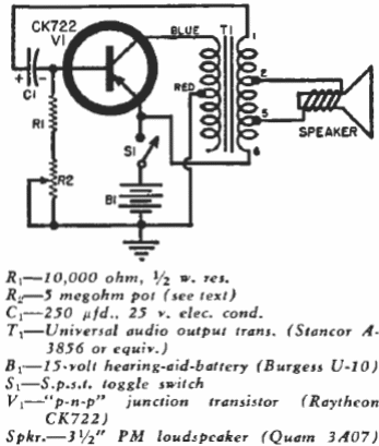 Encontramos este circuito en el manual de aplicaciones del CK722 de Raytheon (volumen 1) de la década de 50. El CK722 es el primer transistor a ser lanzado en el mercado, pudiendo ser usados tipos actuales o preferentemente tipos de germanio antiguos. El transformador es el componente crítico del diseño, pudiendo ser usado una unidad o salida de audio de radio antigua.