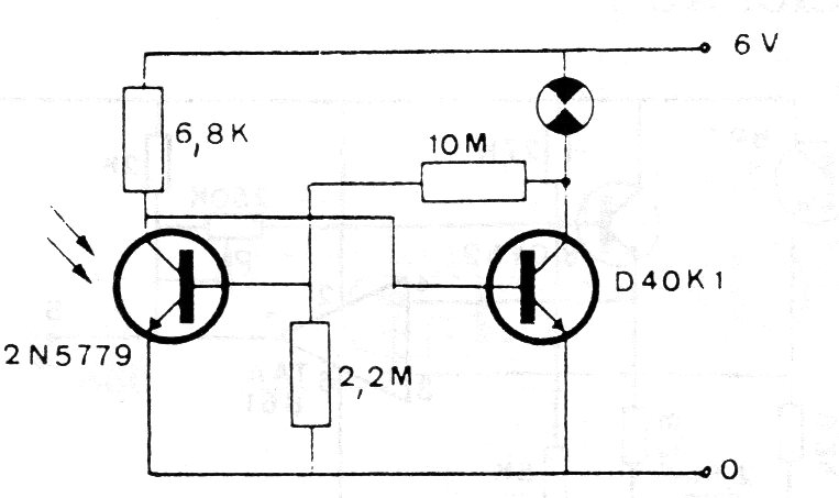 Cuando la iluminación disminuye, este multivibrador entra en funcionamiento, haciendo que la lámpara parpadee a velocidad que depende de los resistores. Los transistores admiten equivalentes y la lámpara indicada es de 6 o 12 V x 50 mA, según la alimentación del circuito.