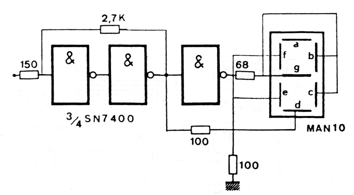 Este circuito, encontrado en una documentación de los años 90, utiliza un display común de LEDs de 7 segmentos. La alimentación debe ser de 5 V y el circuito se presta al análisis de lógica TTL sólo. El circuito sirve como indicador de nivel de salida para un microcontrolador.