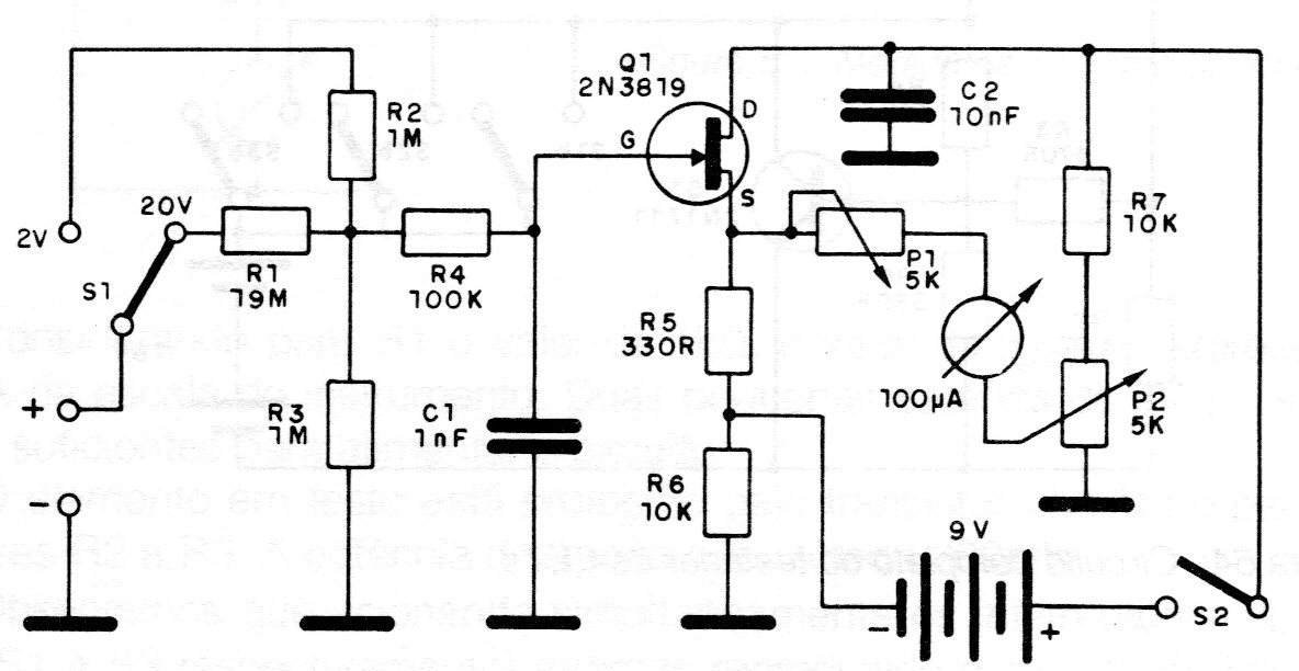Este sensible circuito medidor de tensiones tiene una resistencia de entrada muy alta, del orden de Mohms, pudiendo ser usado con la escala más baja de corrientes de un multímetro analógico común, para aumentar su sensibilidad. El FET puede ser el BF245 o equivalente y la alimentación es hecha por una batería de 9 V.