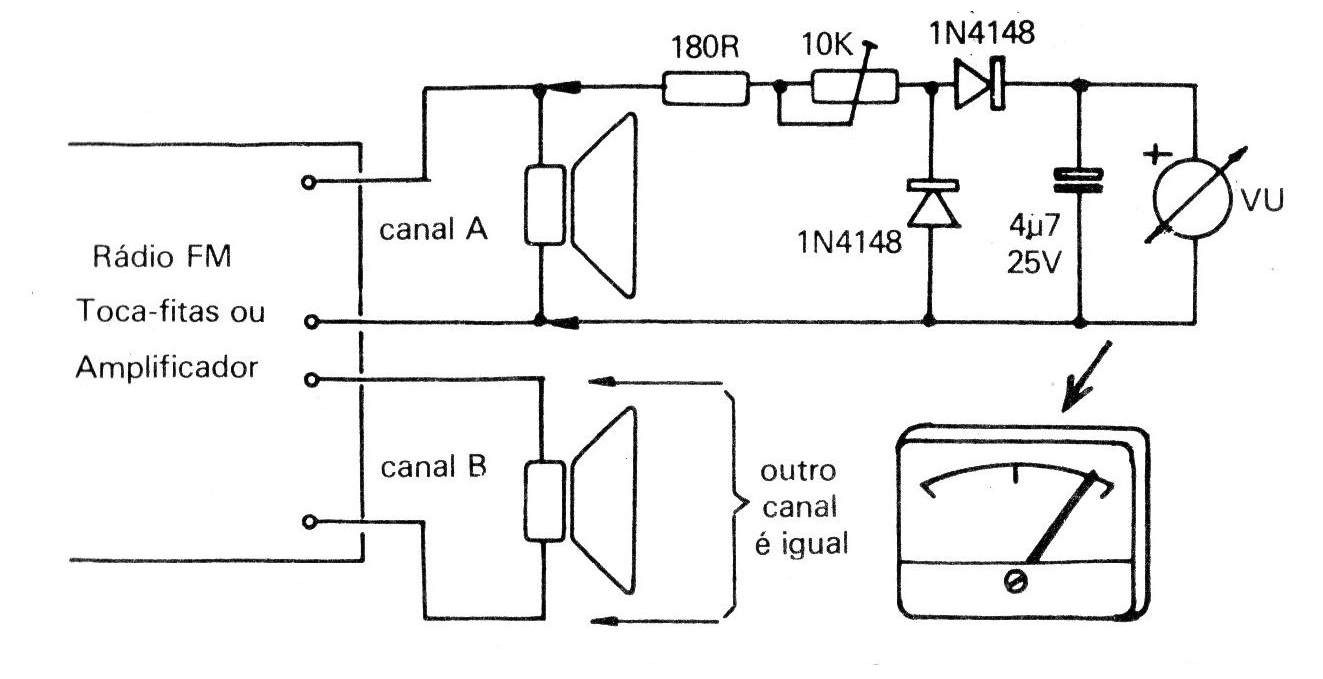 Este circuito fue indicado para aplicaciones automotrices, pero puede ser usado con amplificadores comunes con potencias, unos 100 W. El indicador (VU) es un microamperímetro de 0-200 uA del tipo encontrado en muchos equipos de sonido. El trimpot ajusta el fondo de escala.