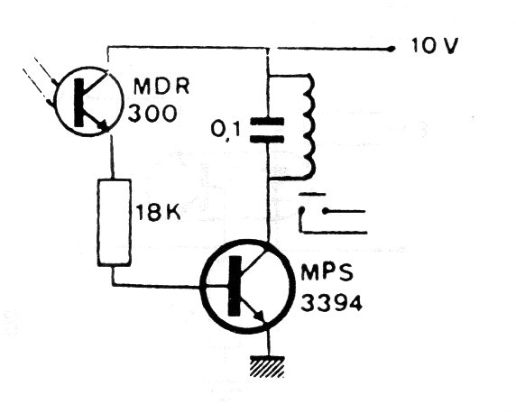 Este simple circuito, que requiere un relé de baja corriente (50 mA) para alimentación de 5 a 12 V, fue encontrado en una documentación de los años 80. El transistor puede ser el BC548 y el foto-transistor cualquier tipo sensible sirve. Un potenciómetro de 10 k entre la base y la tierra del circuito se puede agregar para servir de control de sensibilidad.