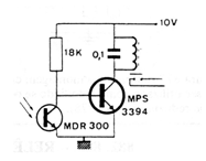 Esta configuración bien conocida acciona un relé cuando la luz que incide en el foto-transistor es cortada. El transistor puede ser el BC548 y el relé de 50 mA o menos con tensiones de 5 a 12 V según la alimentación. El resistor de 18 k puede ser sustituido por un potenciómetro de 100 k para tener un ajuste de sensibilidad.