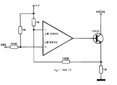 Este circuito se basa en un amplificador operacional de transconductancia, fijando la corriente drenada por la salida a partir del control por una tensión de entrada, como muestra la fórmula junto al diagrama. El valor del resistor de 1k se puede cambiar a corrientes más intensas, en cuyo caso el transistor debe estar dotado de un disipador de calor. El circuito es sugerido por Texas Instruments y el amplificador operacional debe ser alimentado por una fuente simétrica. Vea en buscar datasheet más información sobre las características y pinagem del circuito integrado usado.