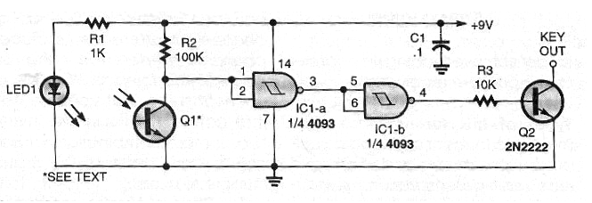 Este circuito fue sugerido en una edición del año 2000 de la revista Poptronics. La revista ya no existe, pero el circuito puede ser implementado con facilidad, pues los componentes todavía se pueden encontrar. El sensor consiste en un acoplador óptico hecho con un LED y un foto-transistor. El circuito se activa cuando la luz se interrumpe. En la salida (pino 10) ya tenemos una etapa de potencia para el accionamiento de cargas de mayor corriente, por ejemplo un relé, motor o solenoide. El cable hasta el sensor debe ser corto. El circuito no debe ser alimentado por fuente sin transformador. Este circuito se puede utilizar como escudo cuando se alimenta por 5 V.