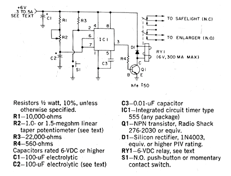 Este circuito fue encontrado en una publicación de 1979, pero es absolutamente actual. El transistor puede ser el BC548, y los demás componentes son todos comunes, incluyendo el relé de 6 V que puede ser de los tipos más populares de 100 mA de bobina. Al apretar S1 el relé cierra sus contactos permaneciendo así por el tiempo ajustado en R2. Este tiempo, con un potenciómetro de 1 M y un capacitor de 100 uF para C2 llegará a unos minutos. Se puede ampliar bastante este tiempo con el uso de un condensador de 1 000 uF para C2, llegando a más de media hora. Otros circuitos similares a éste se pueden encontrar en el sitio.