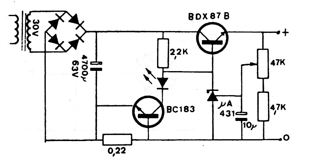 El circuito integrado de referencia de tensión utilizado en esta fuente de los años 80 es difícil de encontrar actualmente. El transistor de potencia puede ser un TIP41 en buen disipador de calor y el transformador tiene 2 A de secundario con diodos para la misma corriente.
